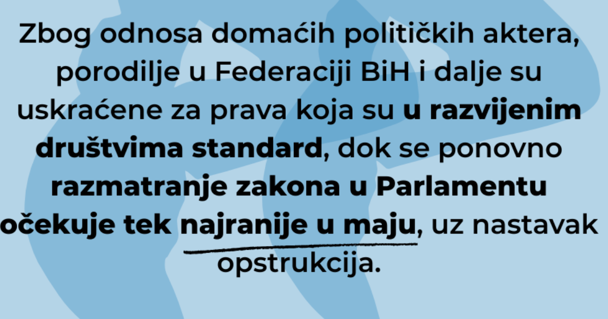 Parlament Federacije Bosne i Hercegovine odlučio je da ne razmatra pravo na pratnju na porodu u skraćenom postupku, već da prijedlog izmjena zakona zadrži u fazi nacrta. Time porodilje nisu samo ostale bez pravne sigurnosti – proces je praktično vraćen unazad, prije nego što je zaista i počeo. Ovaj potez ima jednostavnu političku poruku: odgodi da se ne dogodi.