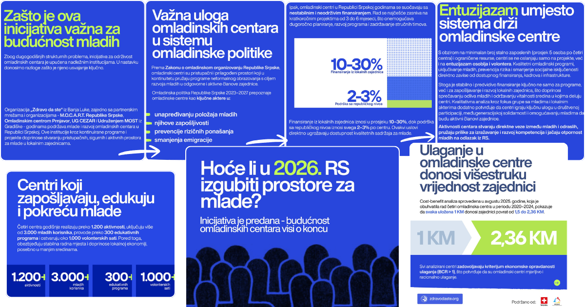 Podsjećamo, kako bi se položaj mladih unaprijedio, početkom decembra 2025. godine organizacija „Zdravo da ste“, zajedno sa partnerima iz Mreže omladinskih centara Republike Srpske (M.O.C.A.R.T.) i omladinskim centrima iz Srbca, Prnjavora i Gradiške, uz podršku Pragg projekta, uputila je inicijativu nadležnim institucijama Republike Srpske. Inicijativa obuhvata prijedloge za uvođenje posebne budžetske linije za omladinske centre već od 2026. godine, obezbjeđenje višegodišnjeg finansiranja, jačanje institucionalnog učešća centara u kreiranju omladinskih politika, standardizaciju minimalnih kapaciteta za rad, kao i jasnije obaveze lokalnih zajednica u pogledu podrške omladinskim centrima. Poseban akcenat stavljen je i na mogućnost uspostavljanja fonda za sufinansiranje projekata u okviru EU programa poput IPA i Erasmus+.